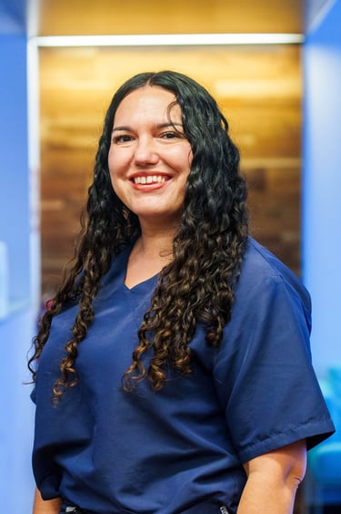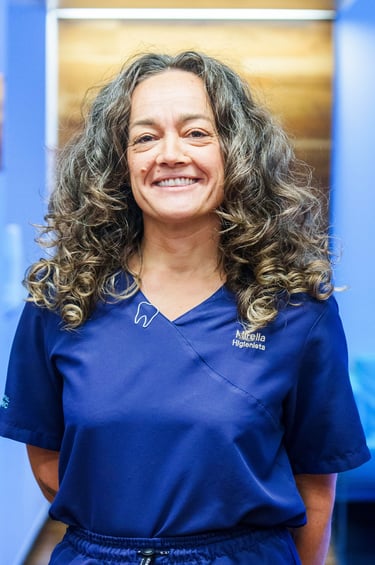 Mirella Castro es higienista dental en la clínica, aportando dedicación, profesionalidad y cercanía en el cuidado diario de los pacientes.